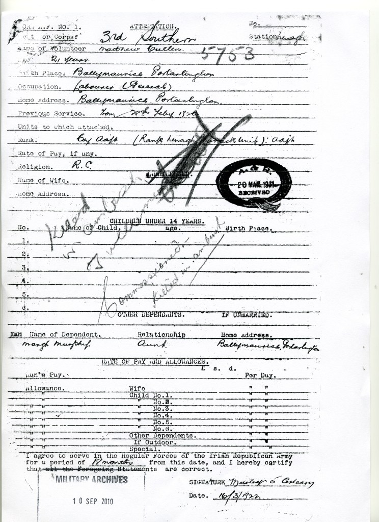 Lieutenant Matthew Cullen, (3rd Southern Division Óglaigh na hÉireann) was only 21 years old. Born 25th May 1901 in Ballymorris, Portarlington County Laois, he was one of five boys born to Timothy and Mary Cullen. Matthew joined the Free state Army on 16th of March 1922 as did his two brothers Thomas and James (my grandfather) and by August 1922 were all stationed at Tullamore barracks. Matthew was also an ex-internee of the Rath Camp in the Curragh of Kildare and was there in Hut 9 on the 9th of September 1921 when the great escape happened.