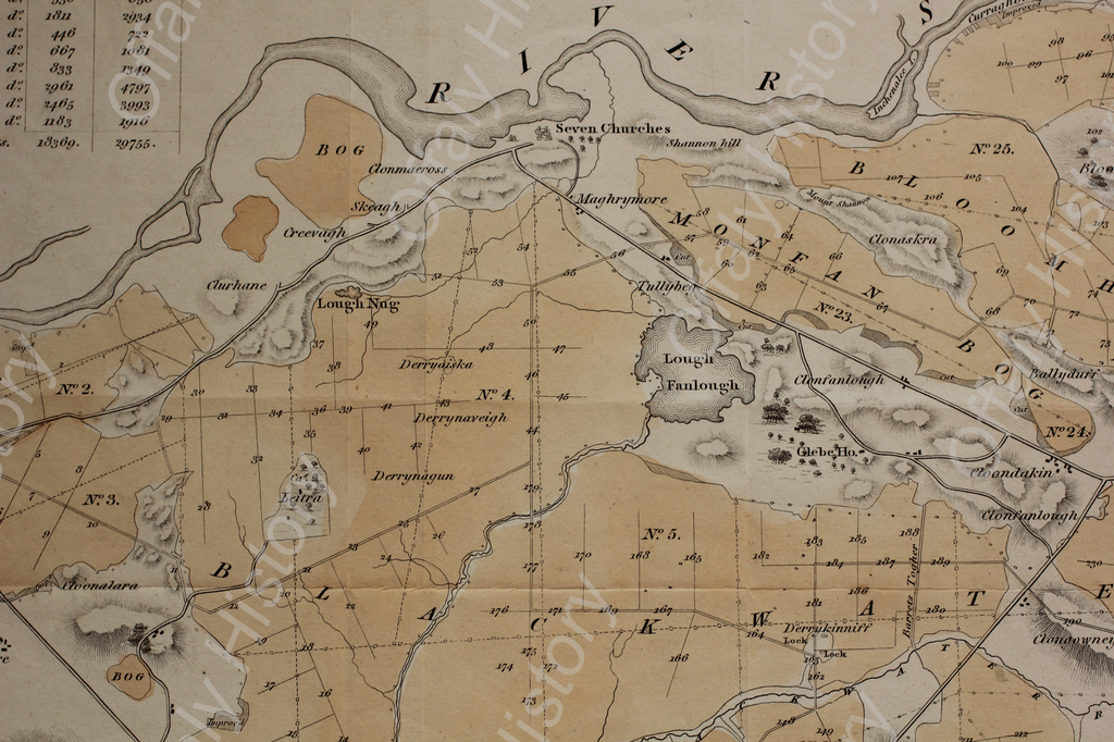 There is no river in or adjoining to this parish except the Shannon which mears it as already mentioned. A lake called Clonsalagh, which is computed to cover ninety acres, produces good pike and perch and some eels. This sheet of water is situated nearly in the centre of the parish, and derives its name from the townland in which it is. On the North and East, it is surrounded by hills, which, if planted, would produce a fine effect, and on the south and west by a large bog. The parish abounds with hills, the tops of which are allotted to pasturage as all the valleys are tilled and produce fine crops of corn; though the general appearance of the soil which is very light and sandy, might lead at first view to an opposite conclusion. There are neither mountains nor woods here, nor have there been any remarkable indigenous plants found.