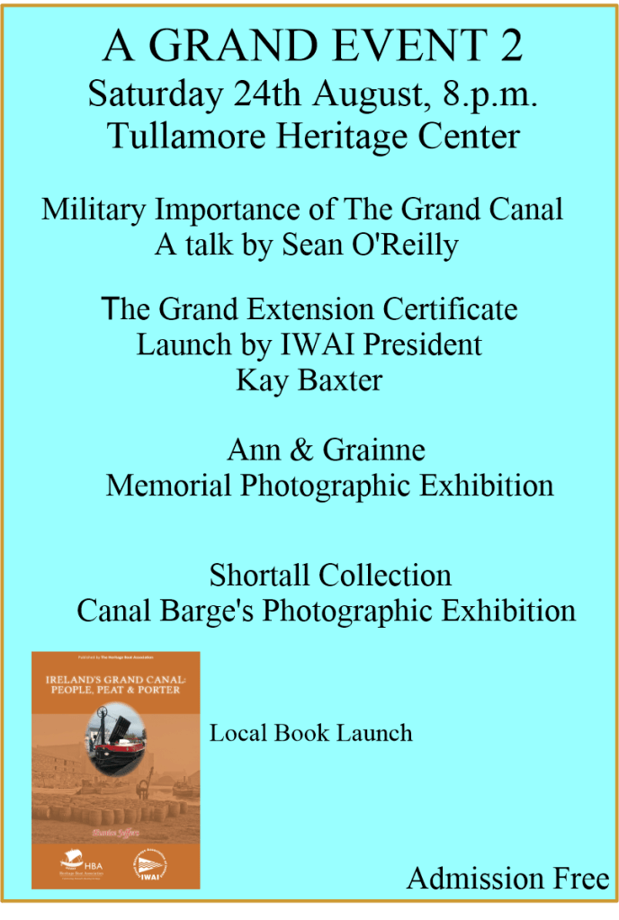 Things have improved so much in recent years with the towpaths now the focus of attention to promote walking and cycling. Today 23 August see the launch of an excellent study of the canal system as illustrated. Then on Saturday evening and Sunday there are two events from Waterways Ireland to be held in the Offaly History Centre Exhibition Hall beside the canal at Bury Quay (neighbour to Old Warehouse Bar and Restaurant), as illustrated.