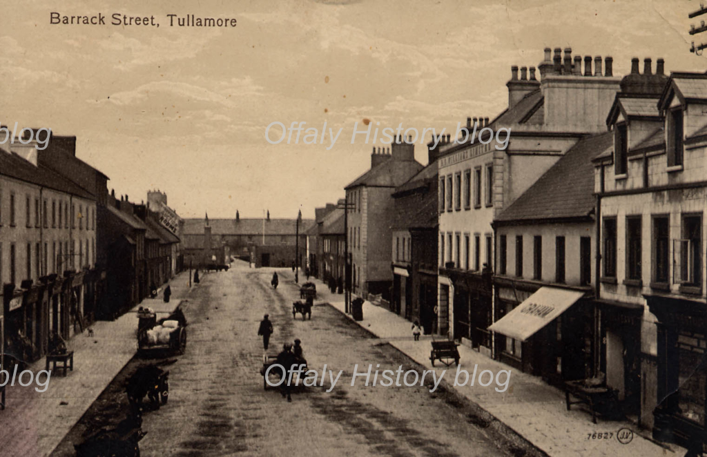 Barrack/Patrick Street, Tullamore about 1910. The barracks dated to 1716 and destroyed in 1922.