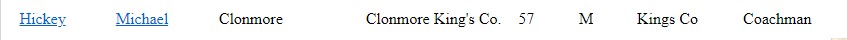 In 1911 Clonmore had 26 houses in the area, during this period the household returns and ancillary, shows us that the population decreased from 220 in 1841 to 101 in 1911. There was 26 houses show on record all of all of Private Dwelling, with all inhabited, with classes of houses between 1st, 2nd and 3rd. Age ranging from 1-80. Here are some of the families that occupied these buildings during this time: