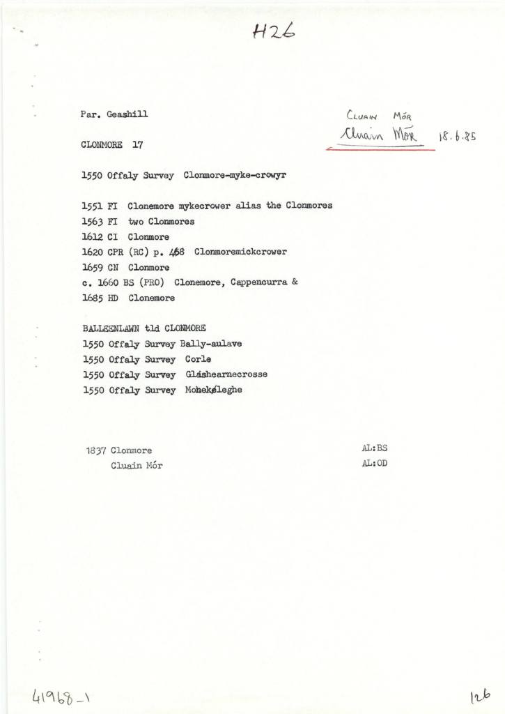 Clonmore (Cappancur), in the Civil Parish of Geashill, in the Barony of Geashill, in the County of Offaly. The Irish name for Clonmore is Cluain Mór meaning Great Field.