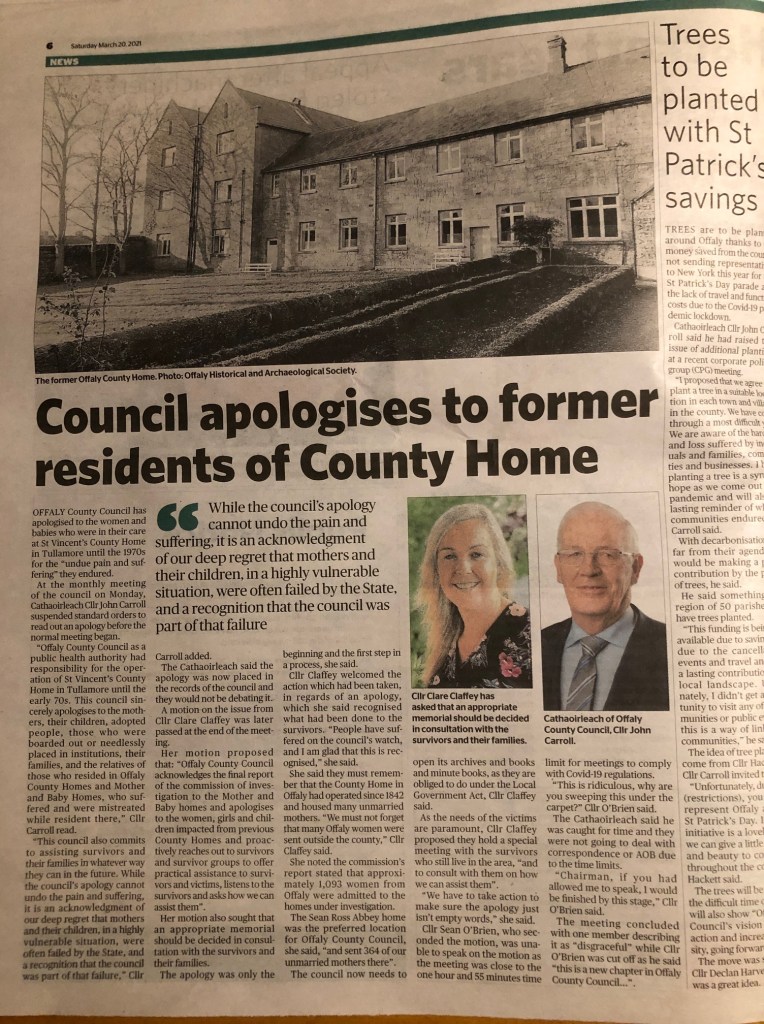 Shame guilt and apologies. The county council apology this week for things past Offaly Independent 20 3 2021. The council’s record on tuberculosis prevention was good with a central dispensary opened at the back of the county infirmary in June 1916. Dr O’Regan had been appointed to the prevention campaign in 1912 and four years earlier Lady Aberdeen had visited the town in support of her personal campaign.