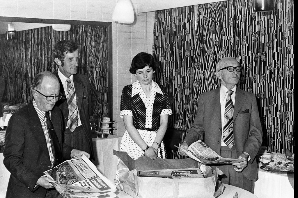 The launch of the Tullamore Tribune in May 1978: Geoff Oakley (G.V.) seen here second from left. From l to r: Buddy Burke, Geoff, Phyllis Byrne, and James I. Fanning.
