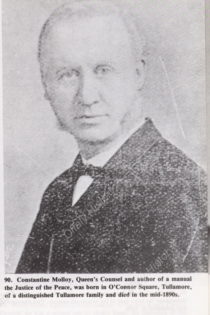 The Molloy family in Tullamore have distinguished antecedents and can include among their number two of the town’s most prominent citizens in the 1820s to the 1840s, Michael Molloy and Anthony Molloy. Michael Molloy founded the Tullamore Distillery in 1829 and from it came the Bernard Daly distillery and that of Tullamore DEW. Michael Molloy was a patron of schools and of the new Mercy convent of 1838-40. The family were the owners of Tullamore up to the 1620s and were the principal landowning family in the baronies of Ballycowan, Ballyboy and Eglish until the Jacobite and Cromwellian plantations. Some such as Charles Molloy had extensive landholdings at Greatwood in Killoughy up to the 1850s. Constantine is a recurring name in the family and one of our regular contributors to this blog, Cosney Molloy, is proud to be called after an early king of Cornwall. Kilcormac and Rahan are strongholds of the family.