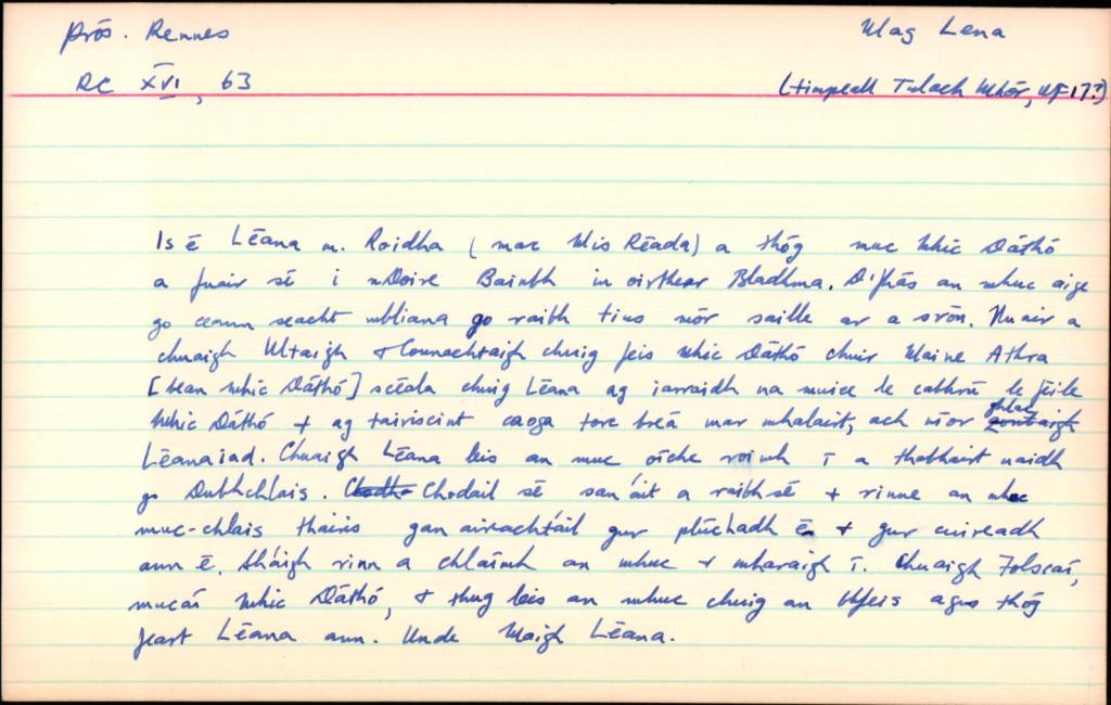 Mag Léna is mentioned in logainm.ie as Moylena and places it in the parish of Kilbride, Co. Offaly. Mag or Magh translates as a plain or open country, there is no information provided on the meaning of the word Léna. Unusually, there are no additional references other than the basic location details, also this older relic from the original card index system below. A 13th century manuscript mentions Cath Mhuighe Léana. Magh Léana is mentioned elsewhere. In his Survey Letters we find O’Donovan used a variety of spellings for the name – Moylena, Moyléna, Moyleana, Moleany and Moy-leana.