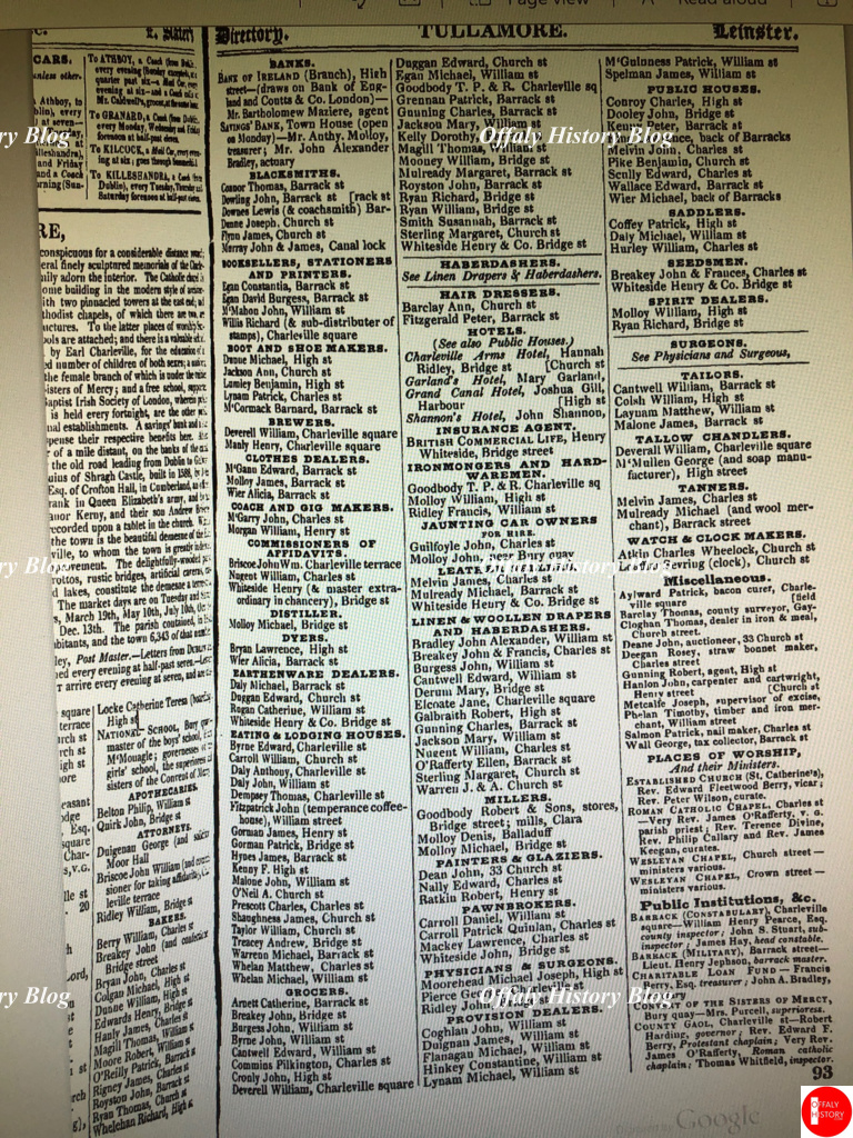 This contribution to local studies was made in 1912 and was based on the writer’s access to a copy of the Tullamore entry in Slater’s Trade Directory published in 1846. At the time there was no public library in Offaly and private reading rooms were few. Neither was there photocopying or digitized copies. Books were expensive and access confined to only a few. There is unlikely to have been any bookshop in Offaly in 1912. By that time Sheppard’s in Birr, the only decent bookshop in Offaly in the mid nineteenth-century, was concentrating on stationery.