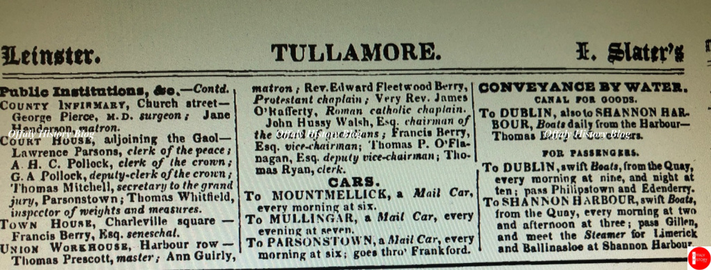 A mail car ran to Mountmellick every morning at six; to Mullingar every evening at seven, and to Parsonstwon every morning at six, passing through Frankford. Conveyance by water canal for goods to Dublin and Shannon Harbour was available by boats running daily-. Thomas Berry and Co., owners; and for passengers by same route, “swift boats,” started from the Quay [near Bury or Whitehall Bridge] for Dublin every morning at nine, and night at ten, passing Philipstown and Edenderry. To Shannon Harbour, swift boats left the Quay every morning at two, and afternoon at three, passing Gillen, and meeting the steamer for Limerick and Ballinasloe to Shannon Harbour. The Very Rev. James O’Rafferty, V G, was P. P. of Tullamore at this time, the curates were Rev Terence Devine, Rev Philip Callary, and Rev James Keegan. The Protestant congregation of St. Catharine’s were ministered to by Rev Edward Fleetwood Berry (Vicar), and Rev Peter Wilson, curate. Mrs Purcell was superiors of the Convent of Mercy, Bury Quay. The other religious denominations do not seem to have had any fixed pastor attached to their congregations.