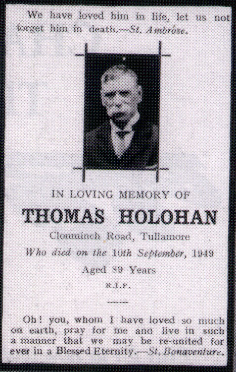 Thomas Holohan (1860-1949) was a member of the rising middle classes of Tullamore. He became Assistant Clerk of the Peace in 1892 and retired as Senior Clerk in the Circuit Court Office in 1942. In 1909 he moved his family from their rented house in Store Street into ‘Innisfree’ (now ‘Loughmore Lodge’) one of the four substantial semi-detached villas on Clonminch Road built as a speculative development by the County Secretary, Charlie Kingston.